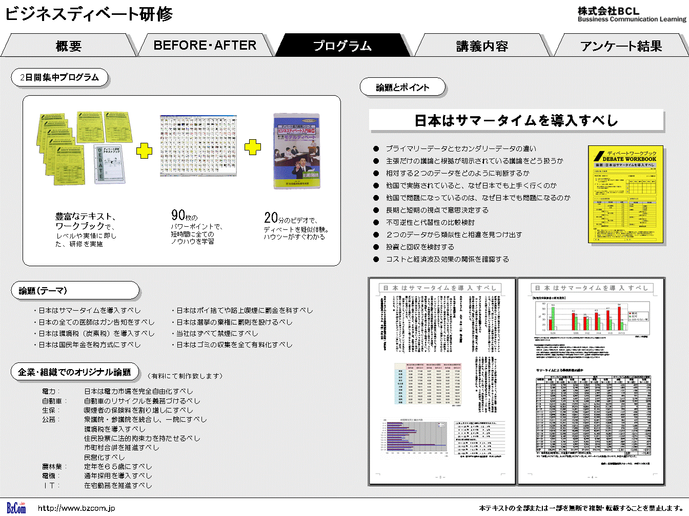 - ビジネスディベートのビデオ教材を活用し、初心者でも1日でディベートとは何か、どのように議論を組み立てればよいかを速習できます。