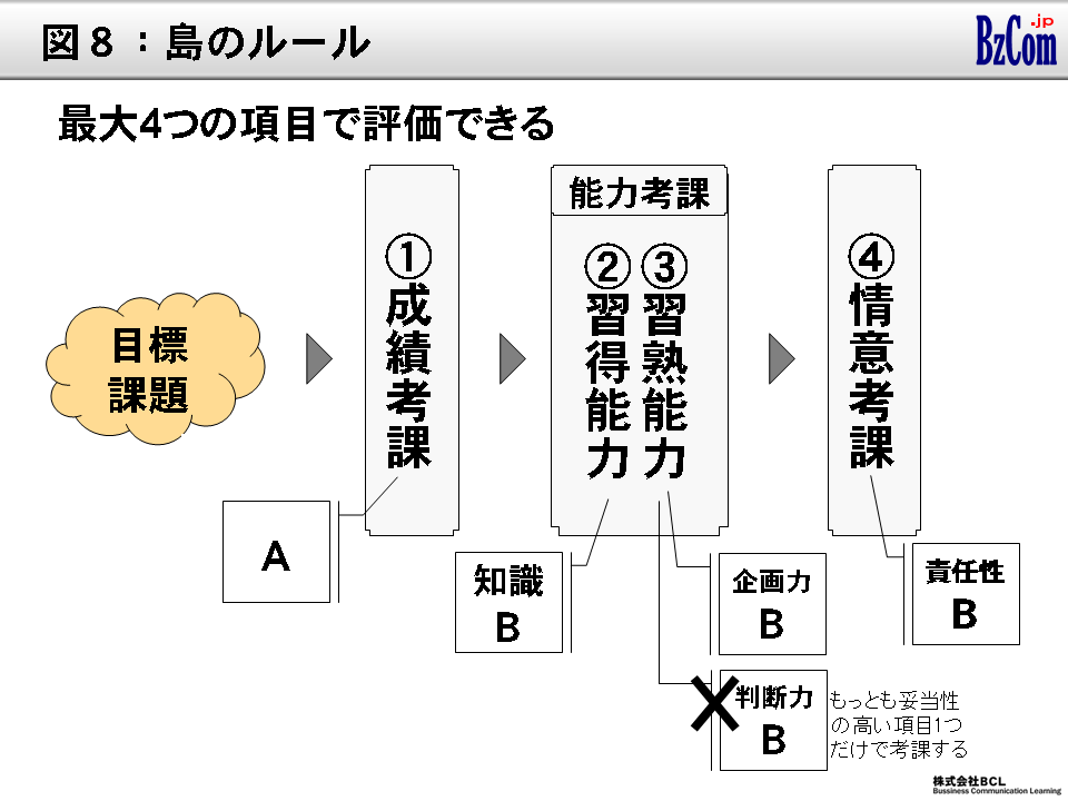 ある1つの業務を考課するときは、成績考課、能力考課、そして情意考課で考課できる。能力考課は習得能力と習熟能力のいずれか、もしくは両方で考課できる。しかし習熟能力の企画力で考課した場合、ひとつの業務で、企画力と判断力の両方で考課することはできない。これを島のルールという。1つの行動は 1つの島の中では1回しか考課できない。言い換えれば、島が違えば最大4回考課できる。(図8および1参照)